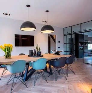 In dit ruime, twee verdiepingen tellende appartement is een geavanceerd domotica systeem geïmplementeerd dat de DALI-verlichting, vloerverwarming, binnen zonwering en thuisbioscoop volledig aanstuurt via Digital Strom. In nauwe samenwerking met diverse partners zijn de beste koppelingen en aansturingen zorgvuldig afgestemd met een optimale gebruikerservaring, zelfs de gashaard en het B&O audio systeem is hierbij geautomatiseerd.